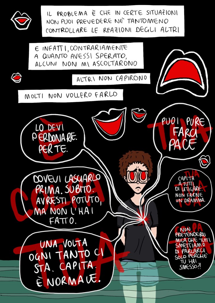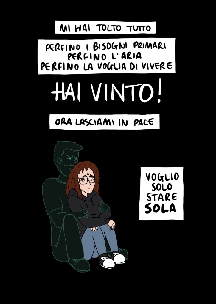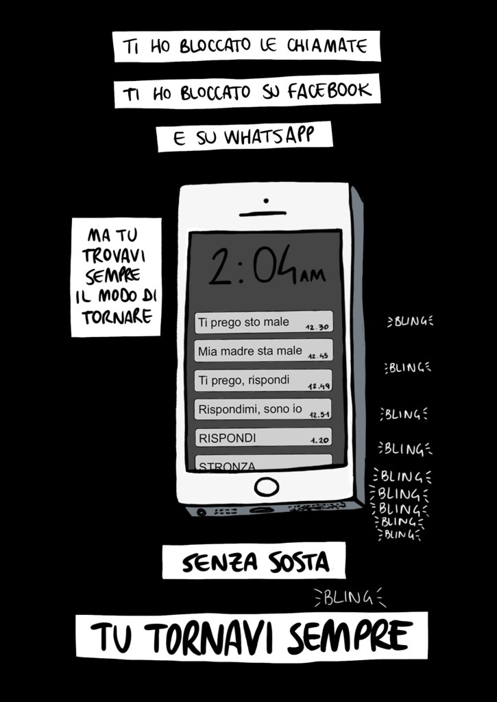 Nessun raptus, nessun gigante buono, niente gelosia accecante o troppo amore, bensì la facilità con cui si può cadere in una relazione violenta, perchè un violento non gira col marchio: “Violento” in fronte, e dall’altra parte l’enorme difficoltà ad uscirne, in una società dove nessuno è disposto ad ascoltare la vittima e schierarsi dalla sua parte, generando un loop infinito di violenza, angoscia e colpevolizzazione della vittima; una società che sceglie deliberatamente di ignorare, finanche giustificare, il ‘bravo ragazzo’ che saluta sempre e che, al contempo, ritiene di poter decidere come e se una donna debba vivere: questo ci mostra Sted, col suo tratto graffiante, evidenziando, tavola dopo tavola, come e perché la violenza di genere ci riguardi davvero tutte e tutti e che chi resta indifferente è inevitabilmente parte del problema.